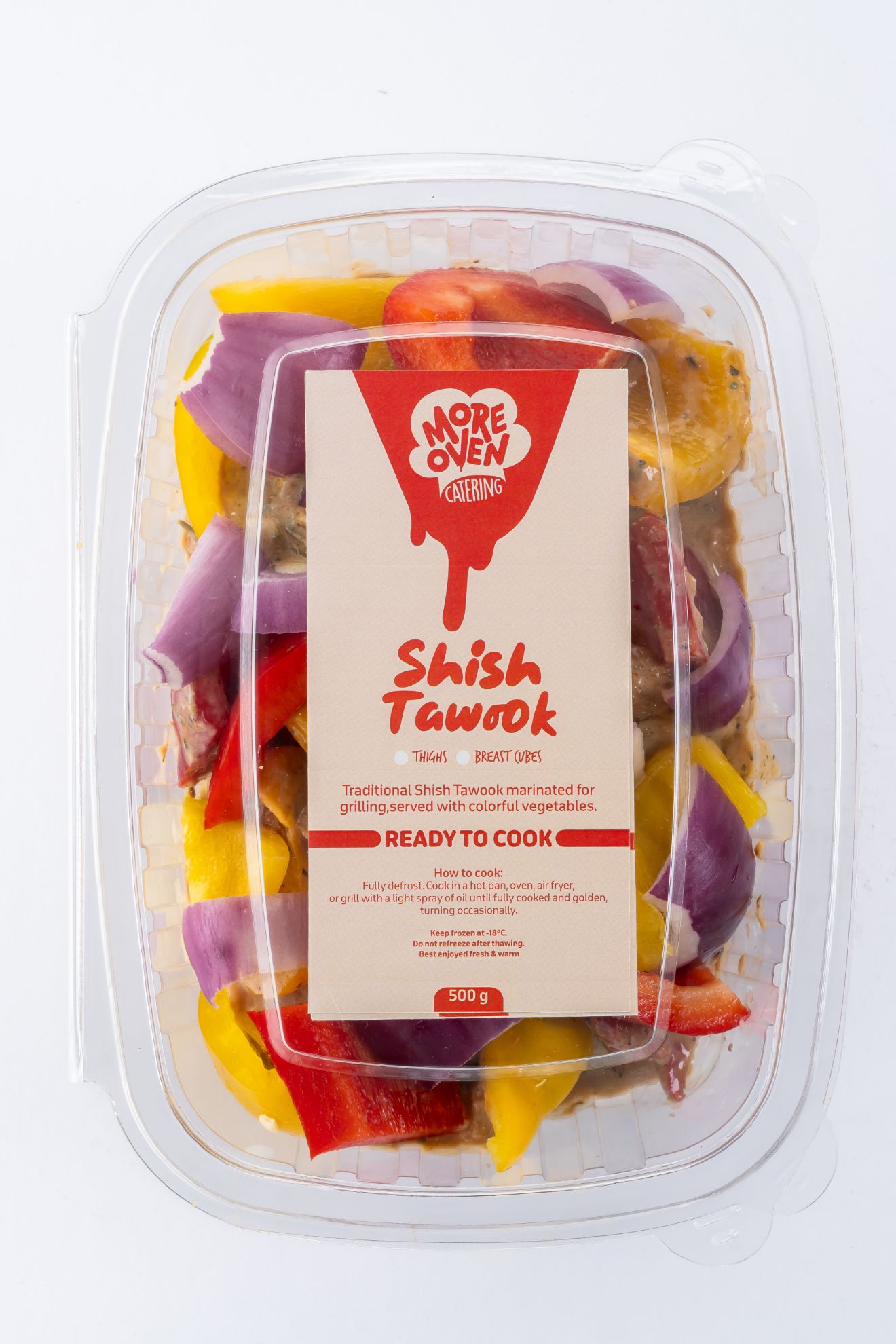 Traditional shish tawook marinated for grilling, served with colorful vegetables.