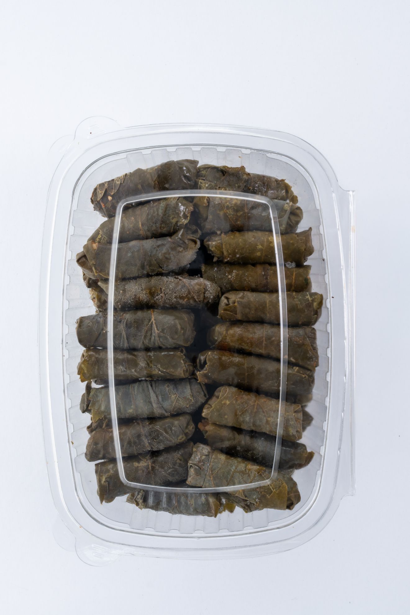 Vine leaves stuffed with seasoned rice, tomato, onions and herbs. (Rice, Vines Leaves,,Greens,Spices, Tomatoes, Tomato Sauce)
